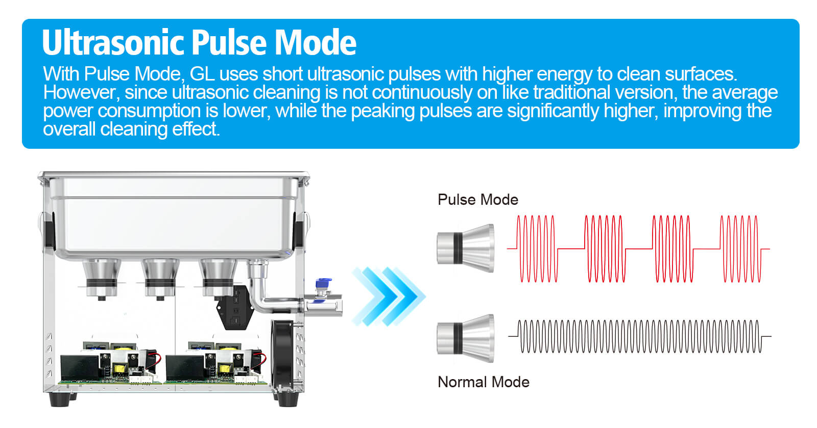 GL Series New Model digital panel ultrasonic cleaner with sweep, degas, heating, mute, pulse, and adjustable power functions, featuring a durable SUS304 stainless steel tank and basket, supporting four switchable frequencies (40/80/120KHz) and customizable in other frequencies and capacities.