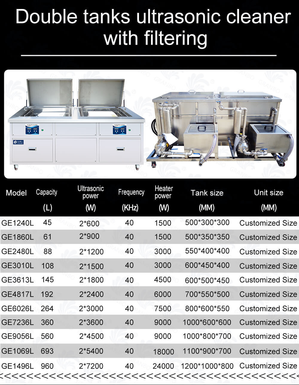 - Feature: Double tank (Ultrasonic tank with filter+Ultrasonic tank with filter) + Industrial grade.