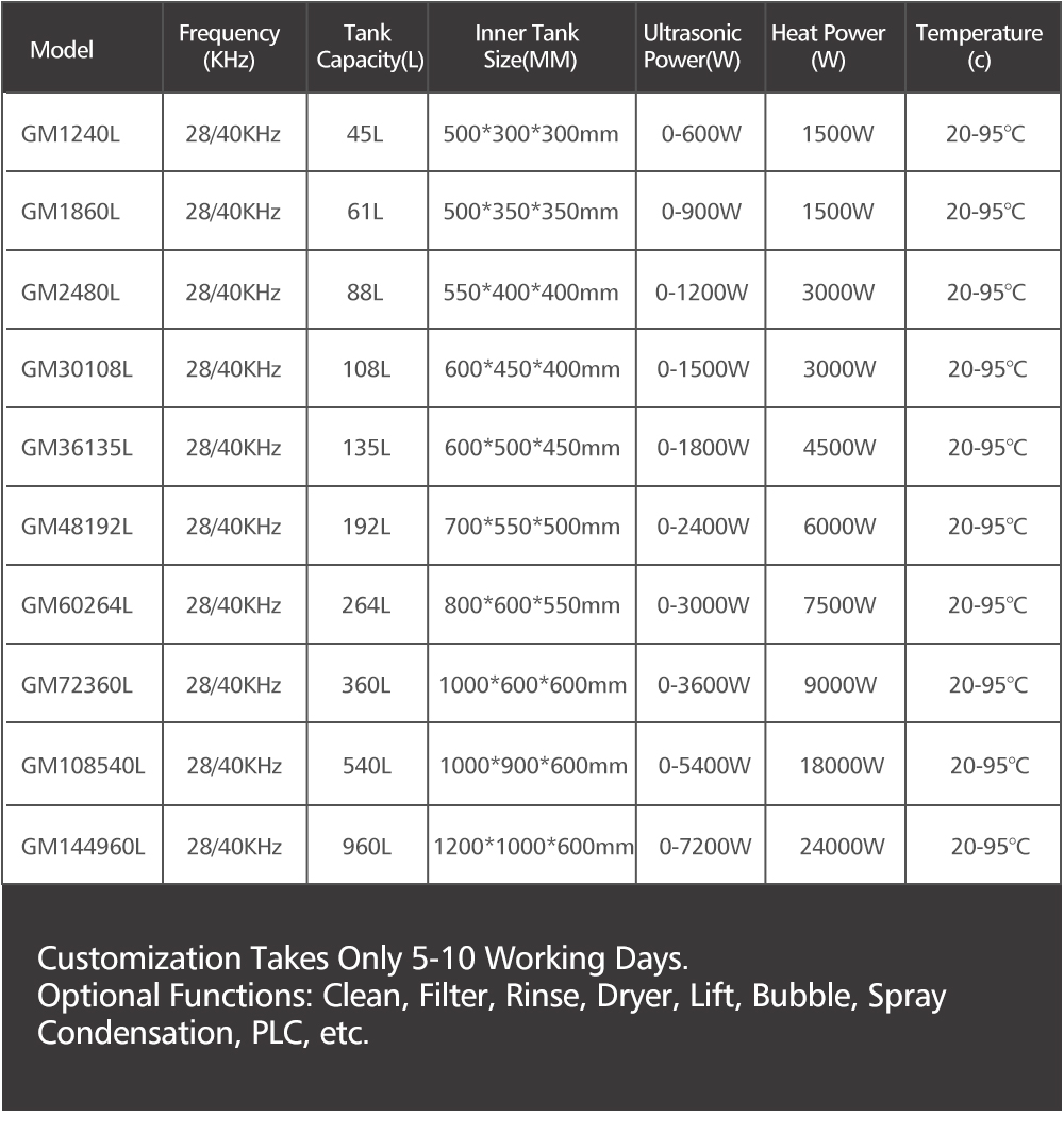 3. Frequency: 28Khz /40Khz /68Khz /120Khz and other customized options.