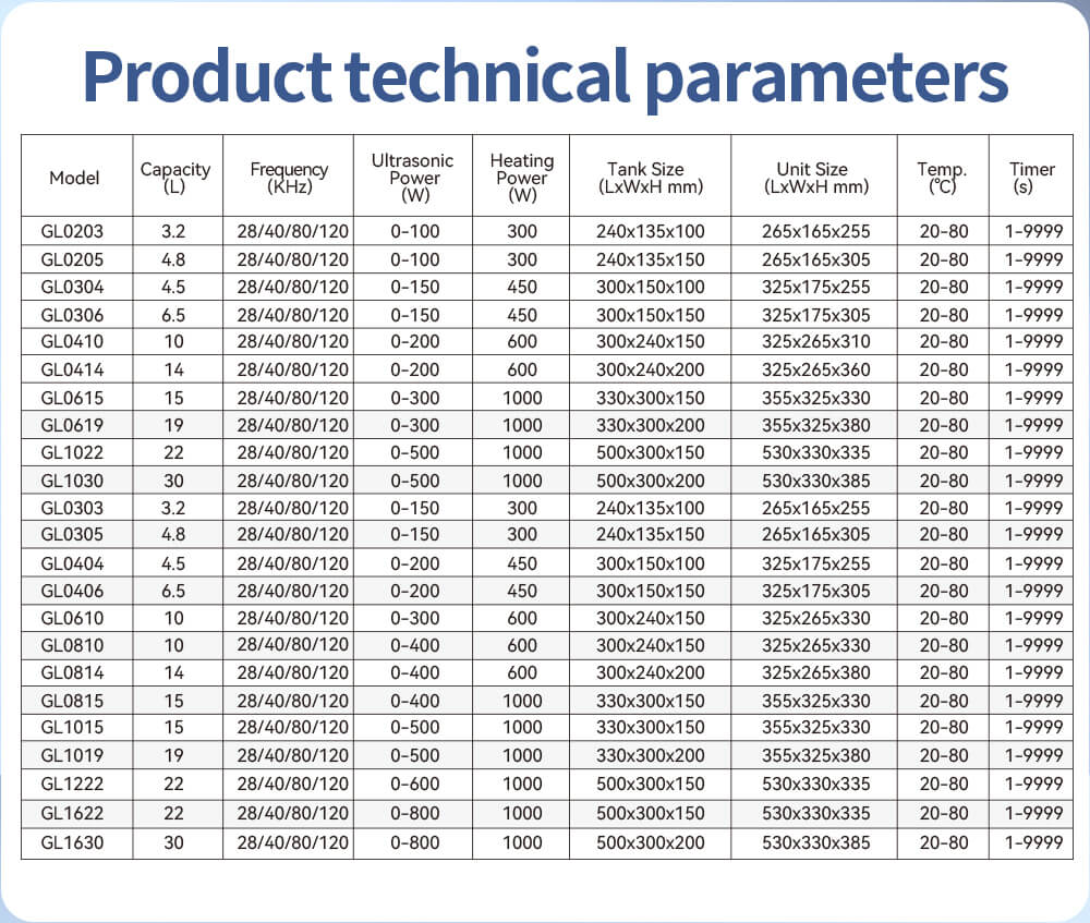 | Model | Transducers | Capacity | Ultrasonic Power | Heating Power | Tank Size(mm) |